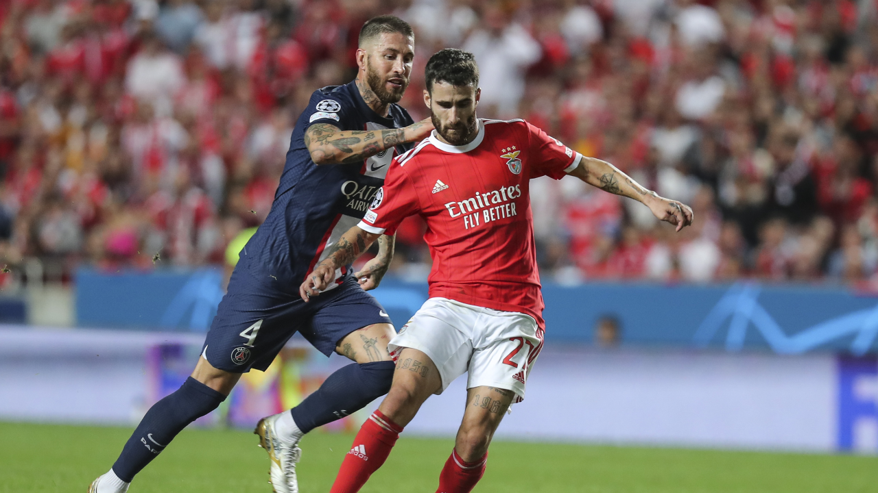 Sem grande história nos primeiros 15 minutos, o jogo só animou quando Hakimi cortou com o braço um cruzamento de João Mário na área, pediu-se penálti mas depois de análise VAR o lance foi anulado por fora de jogo. A espaços a formação francesa chegava à área encarnada graças às arrancadas de Mbappé, mas tanto Donnarumma como Odysseas iam assistindo de longe ao que se passava na zona central do terreno. Até que ao minuto 38′ António Silva derrubou Bernat em falta na grande área, apesar dos encarnados pedirem o fora de jogo do adversário, o árbitro apontou para a marca dos 11 metros. Mbappé chamado a bater, penálti clássico com a bola a ir para um lado, guarda-redes para o outro.